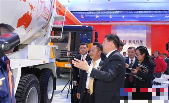 此次參展的混凝土攪拌車上裝是中集凌宇的暢銷產(chǎn)品,美觀大方的罐體結(jié)合聯(lián)合卡車高端底盤,成為展廳一大亮點(diǎn)。上圖為中集集團(tuán)總裁麥伯良饒有興致參觀這臺(tái)攪拌車,中集凌宇副總經(jīng)理胡柏林向麥總介紹凌宇上裝。
